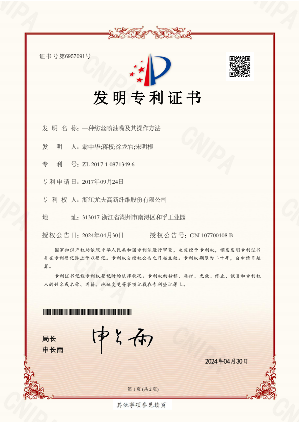發(fā)明專利證書一種紡絲噴油嘴及其操作方法